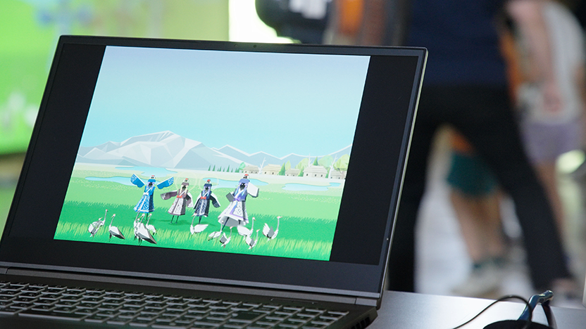 新コンテンツ「ハラㇻキ」では、鑑賞者が顔にお面をつけることで、タンチョウのキャラクターに変身したアバターがスクリーンに出現します。平取アイヌ古式舞踊の所作をもとに、両手を胸の前から外に開くと、アバターがなき声をあげ、その声に呼ばれて仲間のタンチョウが次々とコタンに降り立ちます。クライマックスでは、集まったタンチョウの群れが一斉に羽ばたき、アバターとともに空の彼方へ旅立ちます。これは、「人間界に降りたカムイ(神)が役目を果たした後、カムイの世界へ帰る」というアイヌ文化の言い伝えを表現しています。こうして平取アイヌ古式舞踊の伝承や思想を背景にした「ハラㇻキ」が、BAKERUの新たな仲間に加わりました。