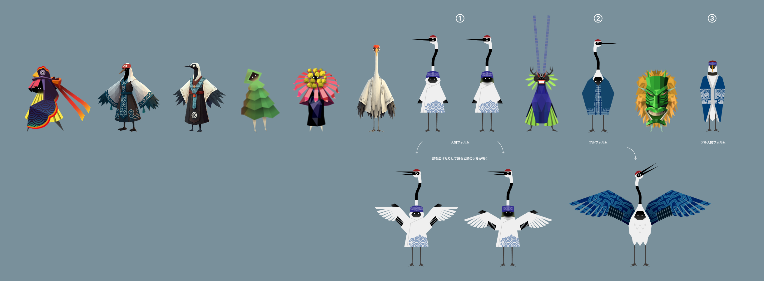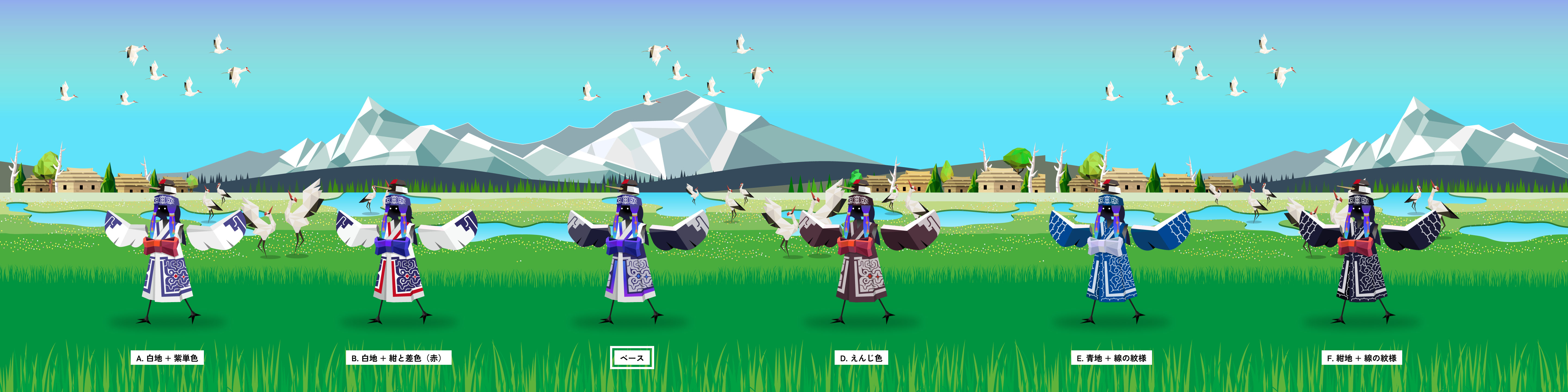 化けるキャラクターはタンチョウをモチーフにデザイン。タンチョウらしさを強調するために、アバターの頭上に装飾としてタンチョウの顔をあしらいました。配色やアイヌ文様は、平取アイヌ文化保存会で使用されているものを参考にしています。またアイヌ古式舞踊の「ハラㇻキ」は女性の舞踊でもあるため、女性らしいフォルムで可愛らしさを表現しつつ、体験中の動きがより自然に見えるようデザインしました。