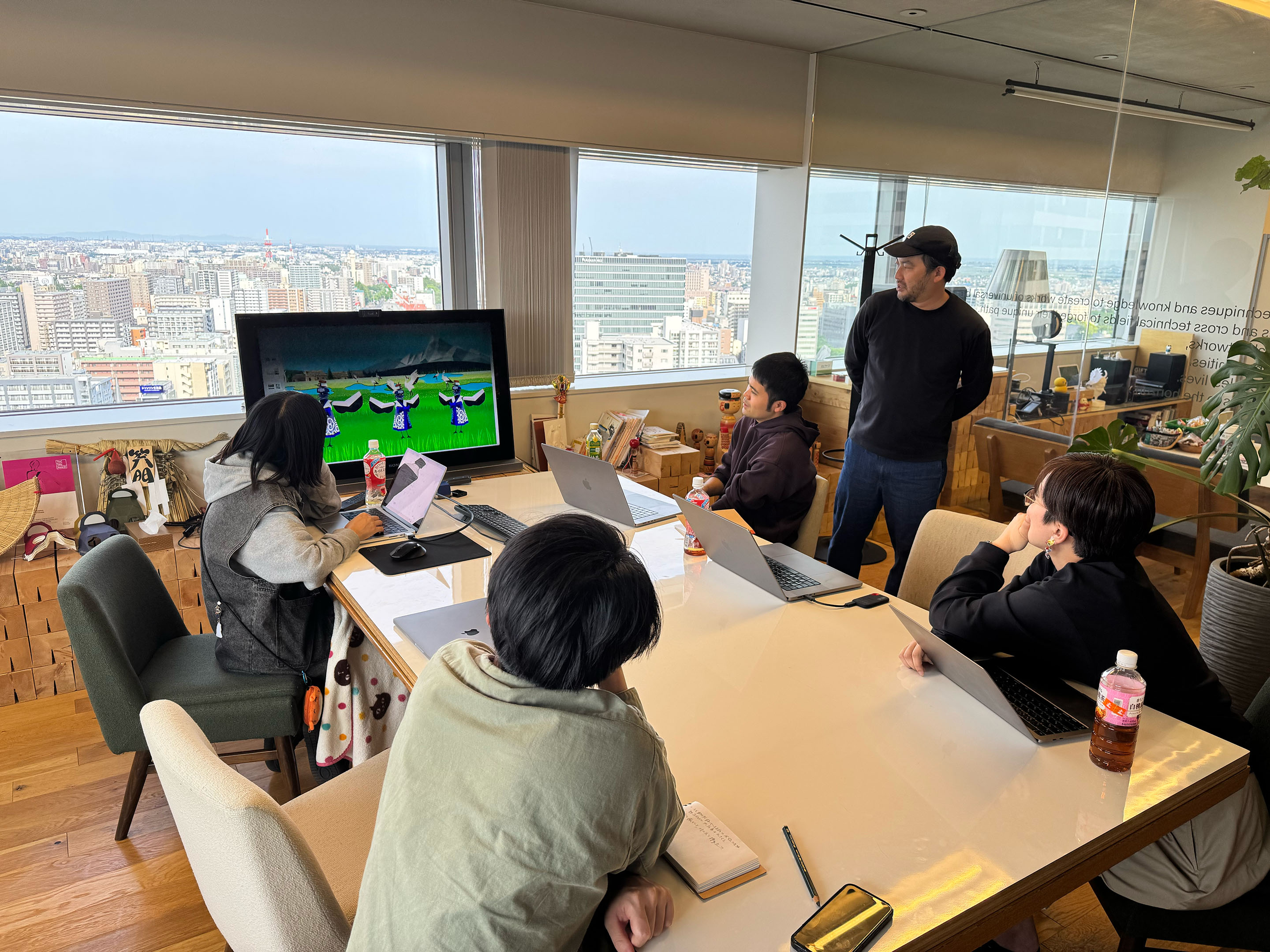 フィールドワークやインタビューを踏まえ、いよいよ新しいコンテンツの制作を開始。これまでのBAKERUでは東北の来訪神や郷土芸能を通して、「なぜ人は神や自然に成り変わり、歌い踊るのか」といった問いに向き合ってきました。古来より人々は、神や自然の依代となる存在に畏敬や恩恵を見出し、そこに祈りや願いを込めてきました。そして歌い踊るという行為を通じて、仲間と喜びを共有し、心をつなげてきたのです。地域や言語が異なっても、人々が祈りやつながりを求める営みは共通しています。今回のフィールドワークとインタビューを通して、私たちはこうした普遍的な心のあり方を改めて実感しました。この気づきを踏まえ、平取アイヌ古式舞踊における「みんなで踊る楽しさを共有する」という心のつながりを中心にした作品づくりを目指すことになりました。
