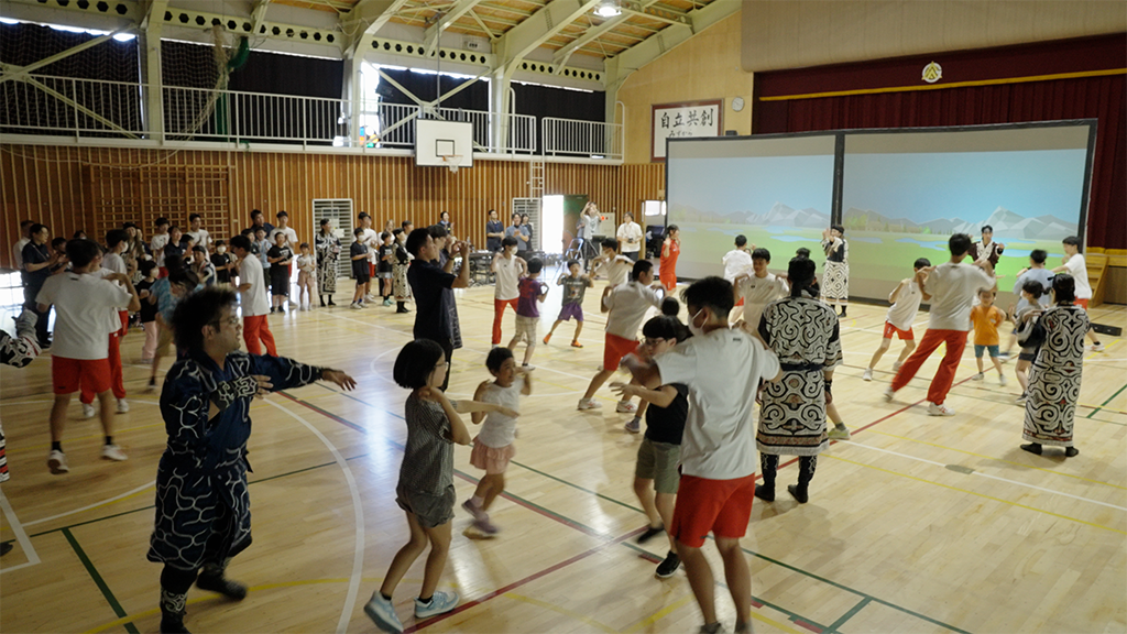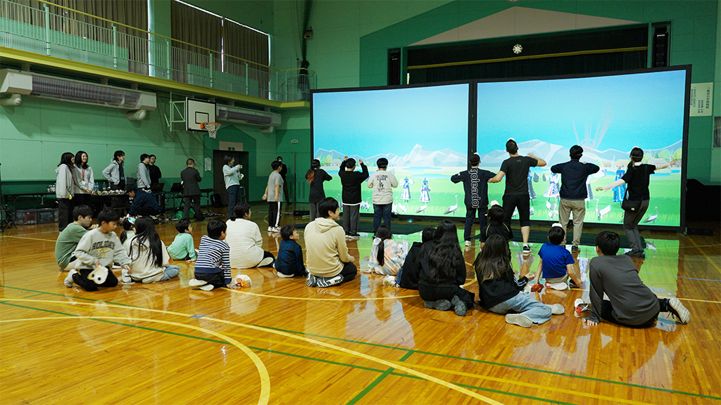 7月上旬の夏めく日に、私たちは阿仁学園を訪れました。阿仁学園は小学校2校と中学校を統合して設立された学校で、1〜9年生の在校生が学年の垣根を越えて過ごしています。まずは、WOWが「デジタルアート」や「BAKERU」について紹介し、続いて平取アイヌ文化保存会の方がアイヌ古式舞踊を披露しました。弓矢を用いる舞「クリㇺセ」や、新コンテンツのテーマであるタンチョウが湿原で遊ぶ姿を表現した舞「ハラㇻキ」など、子どもたちは初めて目にする踊りに引き込まれるように見入っていました。