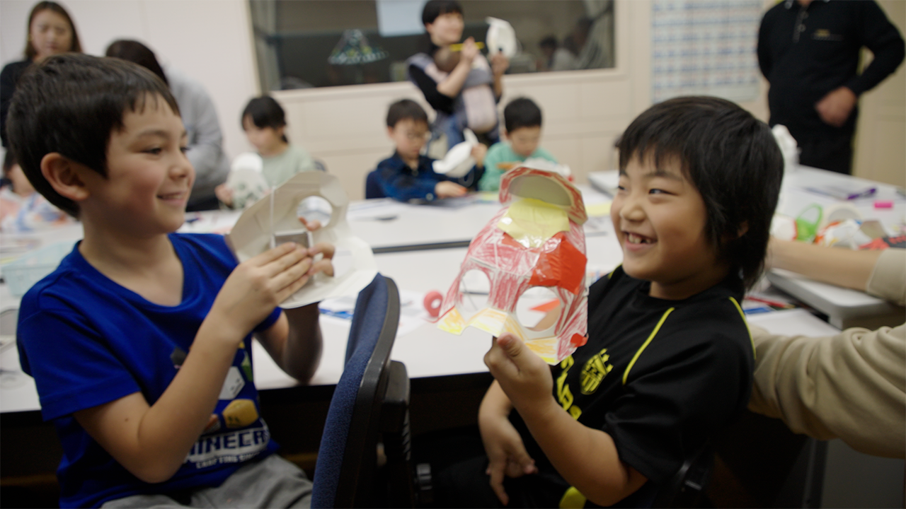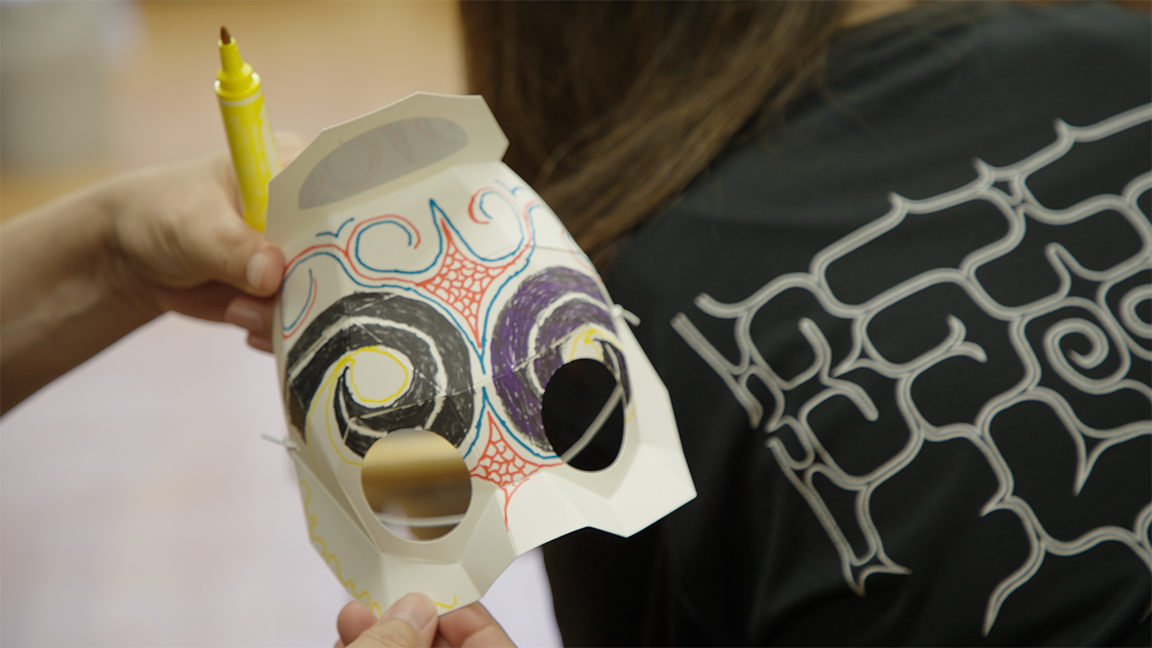 その後、デジタルアート作品「BAKERU」を体験するために必要なお面を制作。北秋田市の自然の恵みに感謝するお面や、アイヌ紋様を取り入れたお面など、一人ひとりの個性が光るお面が出来上がりました。