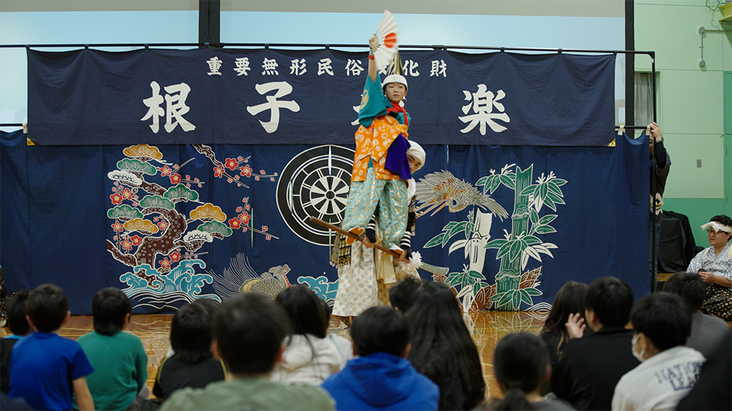 平取アイヌ古式舞踊の伝承や思想を背景にした新コンテンツ「ハラㇻキ」は、北秋田市立義務教育学校 阿仁学園(秋田県)と平取町立二風谷小学校(北海道)でお披露目をしました。秋田県阿仁町の根子集落では郷土芸能「根⼦番楽」が伝承されており、刀を使った演舞などアイヌ古式舞踊と共通点があります。紐解いていくと、どちらの地域も狩猟文化が生活や風土に深く浸透していることがわかりました。こうした重なり合う背景を踏まえて、両校では「郷土芸能の交流」をテーマに「バケルの学校」を開催しました。