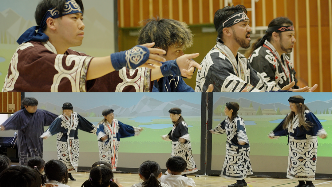 続いて、子どもたちは学年混合のグループに分かれ、平取アイヌ文化保存会の方からアマツバメの舞「チャㇰピヤㇰ」の歌と所作を学び、最後はみんなで踊りました。笑顔で踊る姿は、平取アイヌ文化保存会の方が取材で語っていた「みんなで踊るのが楽しいから踊る」という言葉を想起させる光景でした。