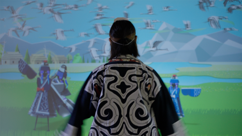 オリジナルのお面を被り、いよいよ新コンテンツ「ハラㇻキ」の体験です。スクリーンにアイヌ文様をまとったタンチョウのアバターが現れると、「かわいい!」「さっきの踊りだ!」と歓声が上がりました。子どもたちは平取アイヌ文化保存会の方の動きに合わせて、両手を胸の前から外に広げる所作を真似し、スクリーンに映るタンチョウを呼び集めながら踊りを楽しんでいました。アイヌ古式舞踊に倣い、仲間と踊ることで生まれる喜びや心のつながりを軸にしたBAKERUの「ハラㇻキ」を平取アイヌ文化保存会の方々も体験。視覚から得られるデジタルならではの一体感を興味深く味わっていました。